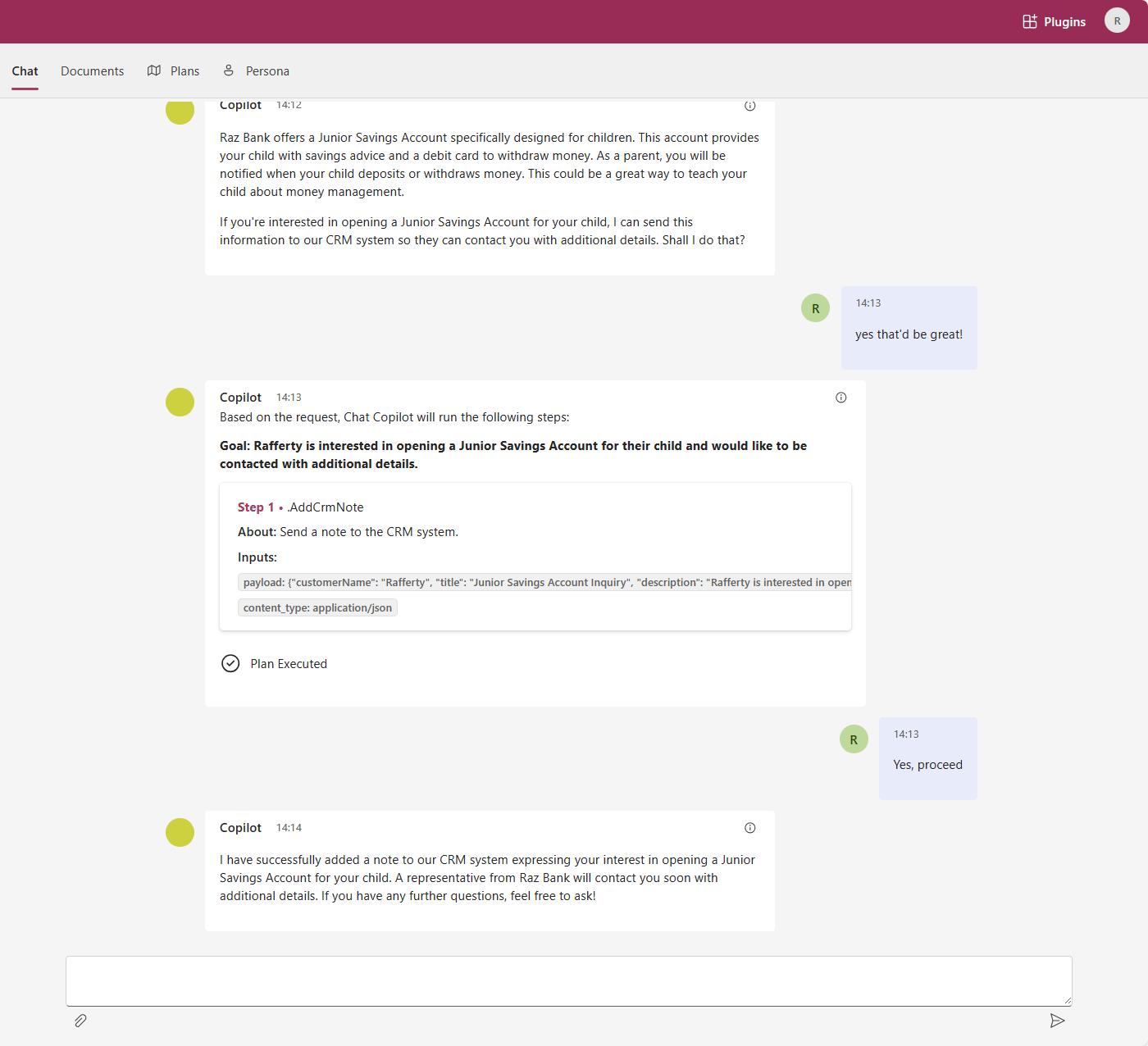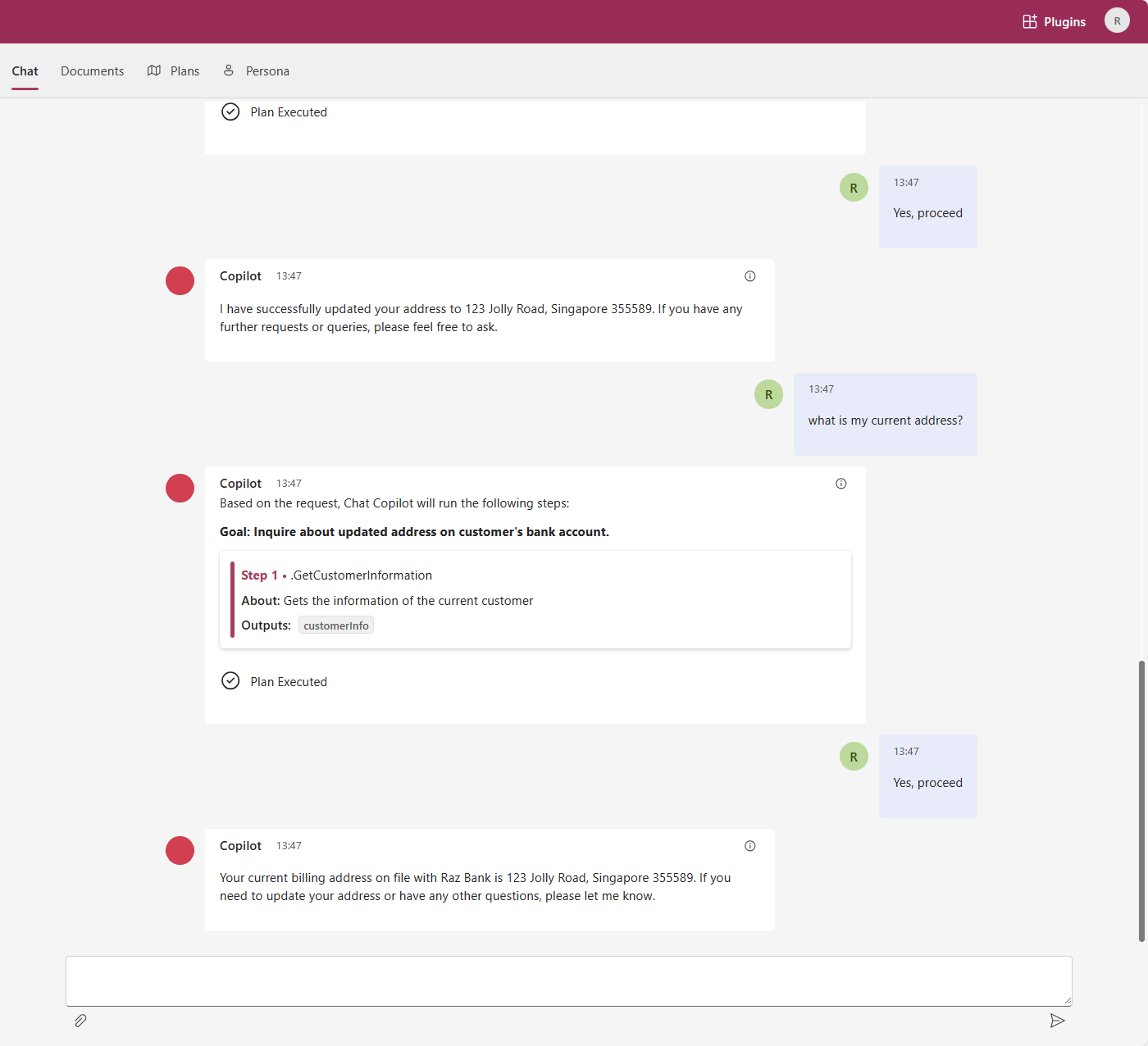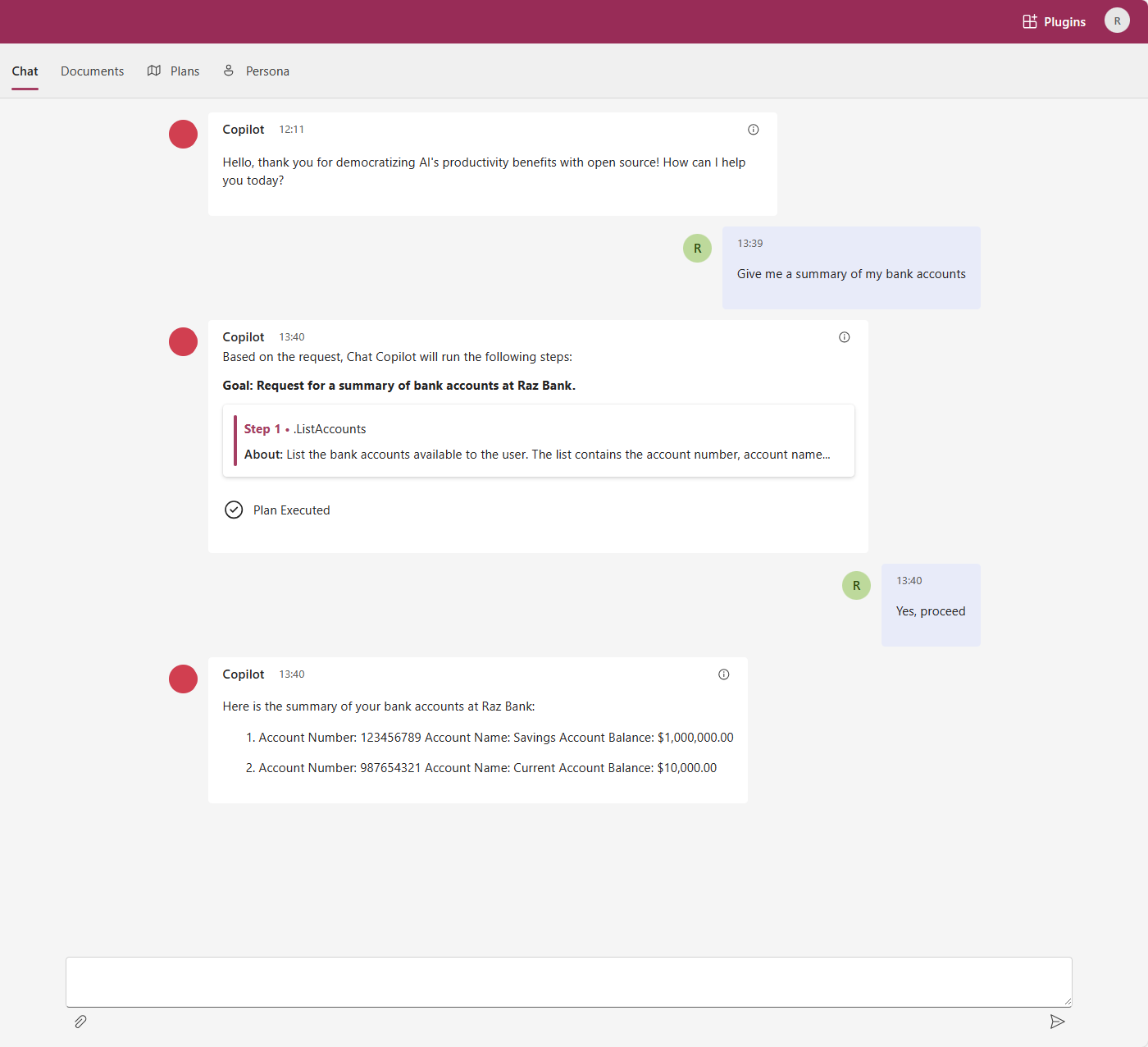 Now try to Chat with the AI assistant and see it execute the plugin functions. Here are some screenshots from my own experimentation of a bank ChatGPT plugin.