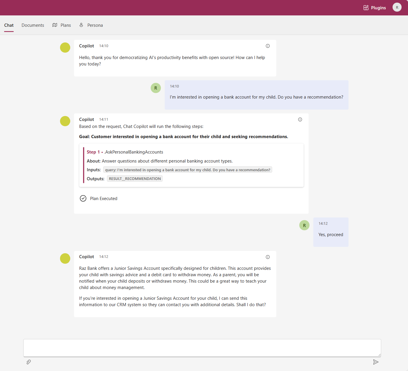 However, to test how it behaves with ChatGPT, we need to plug this into a chatbot. This is where the Semantic Kernel (SK) Chat Copilot come in. In chat conversations, the SK Chat Copilot will use its planner to determine if it’s needed to call a plugin or simply use the ChatGPT model. If a plugin is needed, it will create a “plan” on which functions to call and in what order. It will then call the plugin functions in the order specified in the plan.
